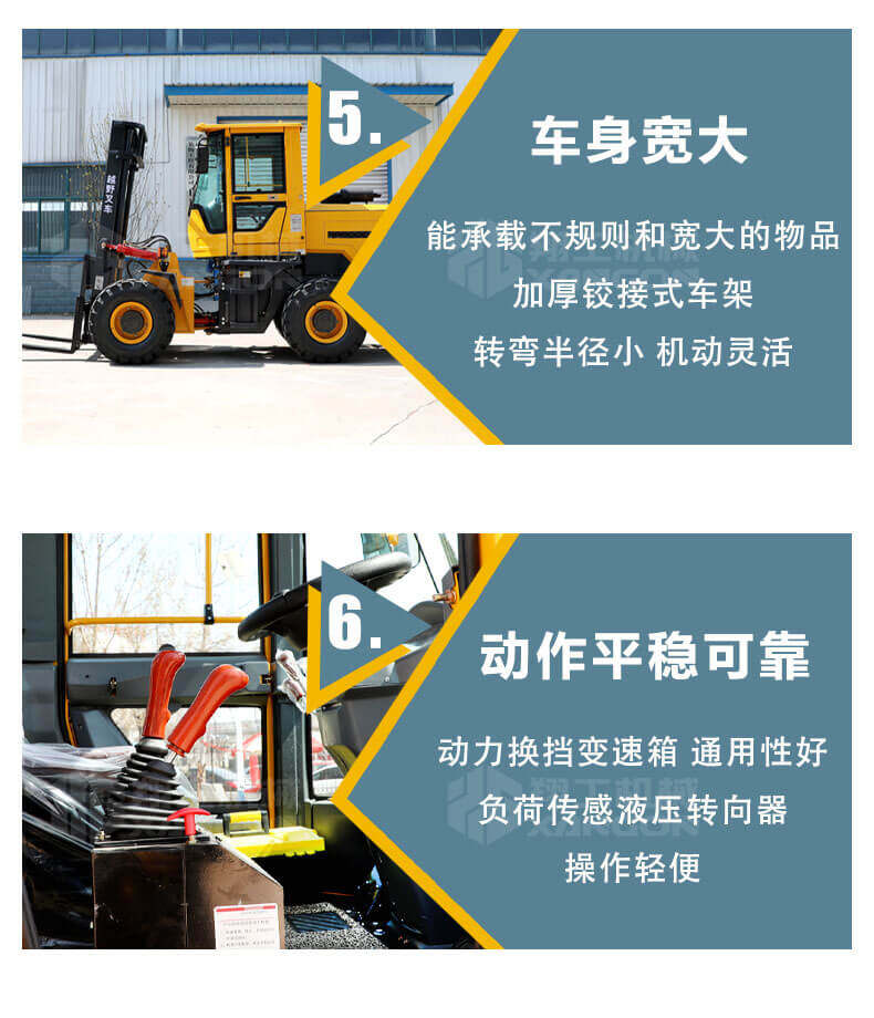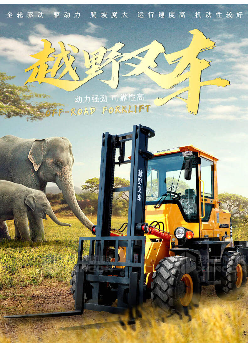 5.越野叉車發(fā)動機功率大,采用全輪驅(qū)動和越野輪胎。