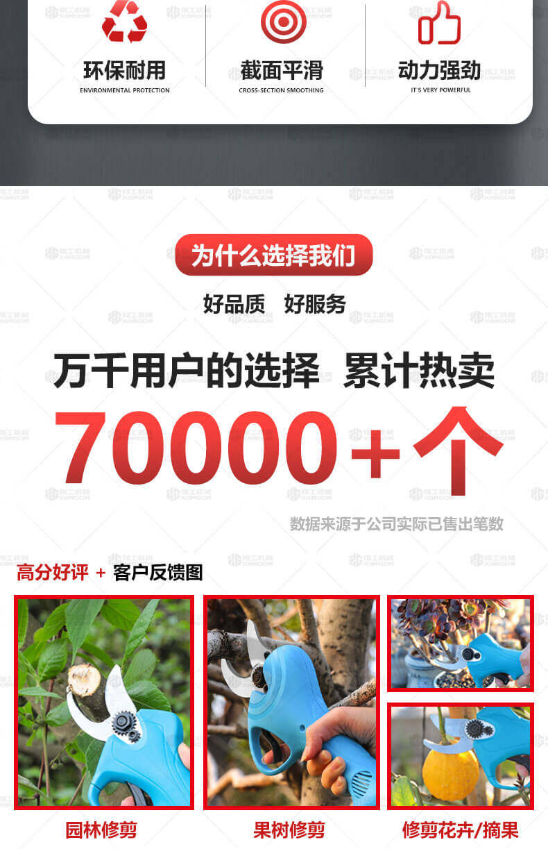 電動(dòng)修枝剪的使用大大提高了植物的修剪效率,降低了修剪工的工作強(qiáng)度,大受人們的喜愛(ài)。滿足了當(dāng)今社會(huì)簡(jiǎn)單輕巧的工作方式,一把小小的電動(dòng)修枝剪不傷手,一年四季均可以使用,解決寒冬酷暑高強(qiáng)度工作的傷害,電動(dòng)修枝剪有多種選擇,這是一款無(wú)線的電動(dòng)修枝剪,使用更加方便。