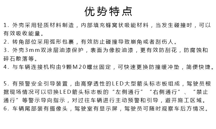 適用于高速公路、國(guó)省干線及市政道路的日常養(yǎng)護(hù)及應(yīng)急搶險(xiǎn)的安全防護(hù)。置于道路車輛、設(shè)備后方,在發(fā)生追尾事故中充當(dāng)肇事車輛和施工作業(yè)人員或設(shè)備的緩沖區(qū)域,降低對(duì)人員的傷害。