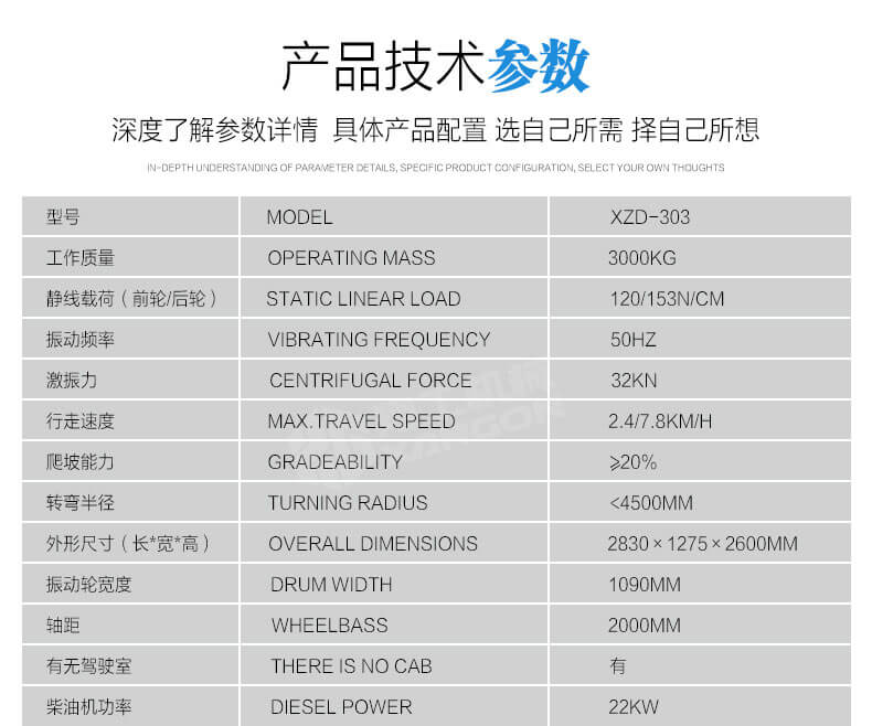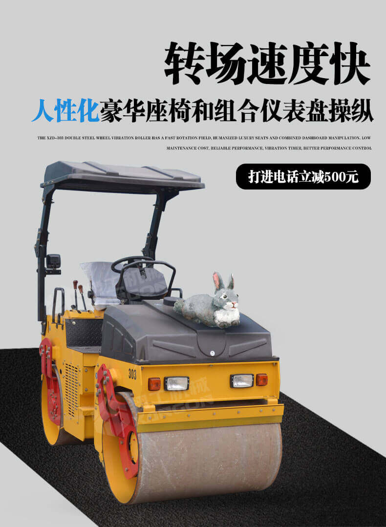 1,XZD-303雙鋼輪振動(dòng)壓路機(jī)轉(zhuǎn)場(chǎng)速度快,人性化豪華座椅和組合儀表盤操縱。維修成本低,性能可靠,配置震動(dòng)計(jì)時(shí)器,對(duì)工作績效更好地控制;