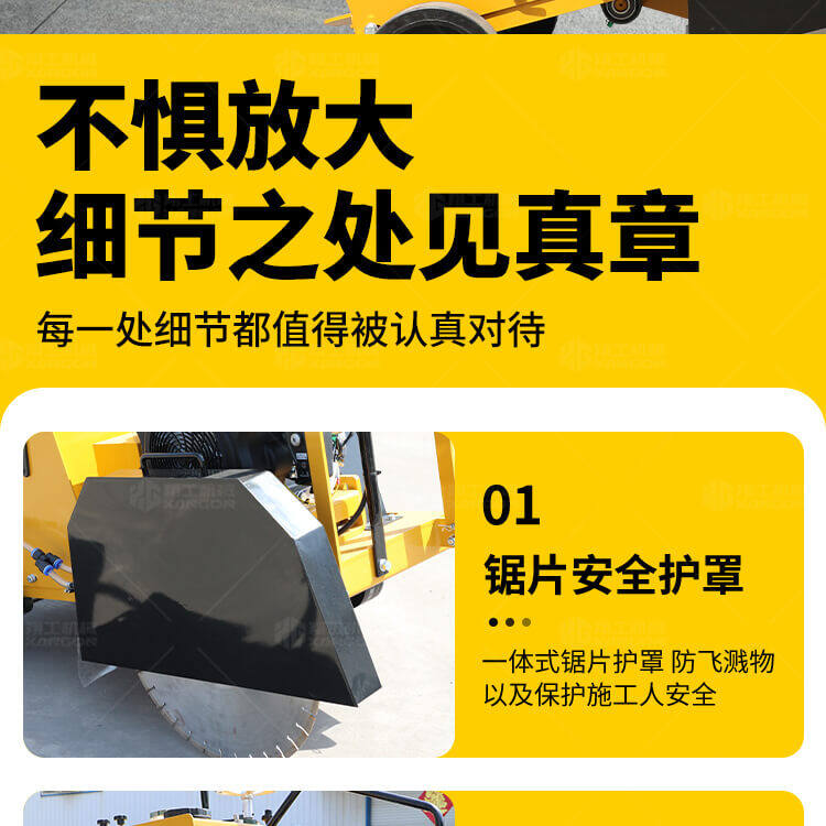 大鋸片大直經(jīng)馬路切割機(jī)自帶水源,降塵降溫,刀片使用壽命長(zhǎng)。